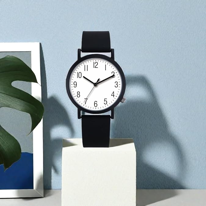 - Classic Design: This analog watch features a sleek, minimalist design with a round white dial and black Arabic numerals for easy time-telling.